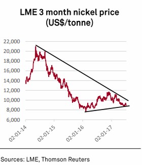 The prospects for an abundance of low-grade ore from the Philippines and Indonesia being available to Chinese smelters producing nickel pig iron are likely to keep nickel prices under pressure. As the supply situation develops further, we may need to further adjust our global balance and price outlook, although we had already factored in some of this extra material. After a weaker-than-anticipated second quarter, we have modestly revised down our annual 2017 price forecast for LME three-month nickel. We now expect prices to average US$9,741/t from our previous expectation of US$9,765/t.