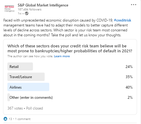 S&P Global Market Intelligence also recently conducted a poll on LinkedIn, asking the public which sectors they believe are most prone to higher PDs in 2021. The results are consistent with our analysis, Airlines, Travel & Leisure and Retail (in this order) were listed as the sectors of highest concern from the answer options provided (Airlines, Travel & Leisure, Retail, Other – respondents were given the option to enter an industry of their choosing in the comments.)