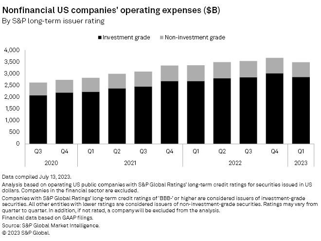 US corporations cut costs in the first quarter of the year as rising interest rates and a weakening economy worsened operating conditions. The total operating expenses of companies rated investment grade by S&P Global Ratings dropped 5.3% in the quarter to $2.858 trillion. Companies with weaker balance sheets also trimmed costs. Total operating expenses of non-investment-grade companies fell 3.8% from the fourth quarter of 2022 to $628.71 billion, according to the latest Market Intelligence data.