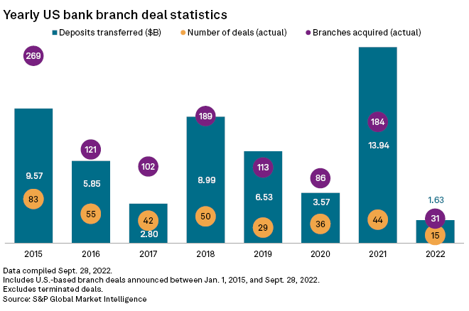 Only 15 U.S. bank branch acquisition deals have been announced in 2022 as of Sept. 28, down from 44 in all of 2021, according to an analysis by S&P Global Market Intelligence. Digitization and online banking have forced banks to cut down on their branch networks. At the same time, banks are looking to strike a balance between increasing digital adoption and maintaining a physical footprint.