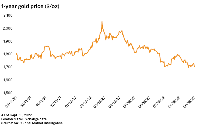 Aggressive interest rate hikes to tame inflation have led to an 18.9% slump in gold prices since March, according to S&P Global Market Intelligence data. The price of gold fell $389 per ounce to $1,667.10/oz on Sept. 15 from a peak of $2,056.10/oz on March 8. Some analysts see the retreat as a blip and predict higher prices in the years ahead.