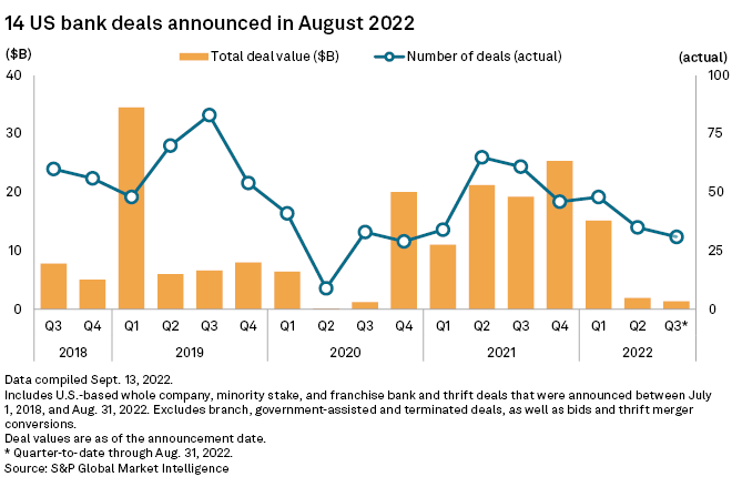In this edition of Insight Weekly, we put a spotlight on the global slump in dealmaking. Only 14 U.S. bank M&A deals were announced in August compared with 17 deals in July. However, aggregate deal value jumped to $891.4 million from $457.5 million, according to S&P Global Market Intelligence. Due to tight monetary policy and increased regulatory scrutiny for large deals, some superregional banks are looking for nonbank M&A. In the European financial sector, 62 deals were recorded in August, the lowest monthly total year-to-date, according to Market Intelligence data. With the rise in the cost of financing, many companies in the tech space have suffered declines in valuations. In the oil and gas industry, the number of whole-company and minority stake deals declined to 21 in August from 32 a year ago.
