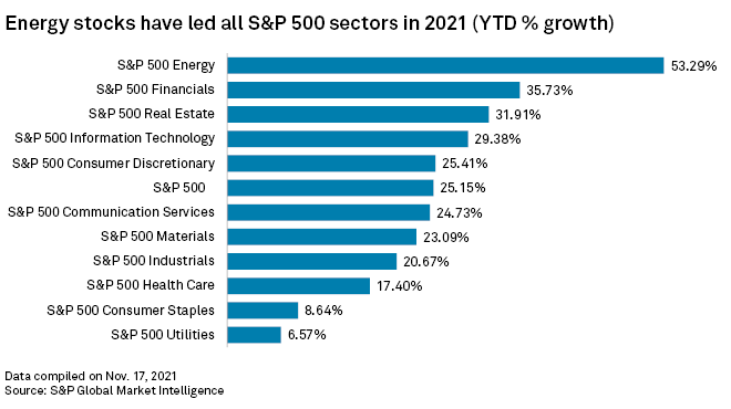 In this edition, we take a close look at the year-to-date performance of the U.S. stock market, which has become an unlikely haven for investors as inflation surges to levels not seen in decades. Since the start of 2021, the S&P 500 has jumped more than 25%. Energy has led all sectors due to increases in crude oil and fuel prices caused by rising demand and limited supply growth. Strong corporate earnings also have boosted stock prices and stoked a risk-on sentiment that is expected to continue through the rest of 2021 and into 2022.