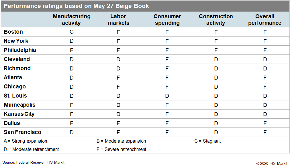 Widespread business closures and social distancing measures intended to mitigate the spread of COVID-19 led to sharp declines in economic activity throughout the country from April through early May according to the US Federal Reserve's latest Beige Book report, containing anecdotal information from regional business contacts. Continued business closures and social distancing measures in the Northeast and along the West Coast led to sustained contractions in consumer spending and employment in those regions. Widespread layoffs, especially in hospitality, retail trade, and tourism-related activities hammered employment in busy urban areas. Less-severe lockdown measures in the Midwest still resulted in large drops in economic activity. Food manufacturers throughout the Plains state and the South contended with shutdowns as COVID-19 infections spread through their workforces. Lower demand for steel from the energy sector combined with temporary shutdowns of auto manufacturing plants in the Midwest resulted in rapid declines in durables manufacturing activity across most regions. While homebuilding remains limited in the Northeast as restrictions on worksites persist, existing projects started up in the South and Midwest.
