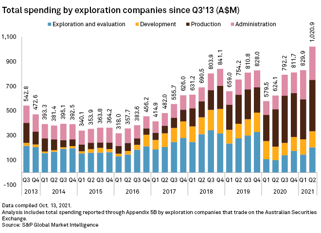 In this edition, we take a close look at the midstream sector's forthcoming third-quarter earnings, which are expected to see strong gains assisted by rising commodity prices. According to analyst consensus, year-over-year growth in adjusted EBITDA and revenues should prevail for most of the 11 major North American midstream companies analyzed by S&P Global Market Intelligence. The commodities price surge is also easing fundraising for Australia-listed exploration companies, helping the sector boost spending to record levels.