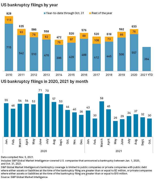 Corporate bankruptcies have fallen to historic lows this year, thanks to open capital markets and a flood of liquidity keeping businesses afloat through the pandemic. A total of 364 cases were filed in the first 10 months of 2021, lower than any of the prior 11 years and a drastic fall from the Great Recession era, when thousands of companies sought court protection each year.