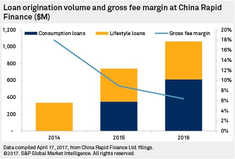 In 2014, when the company originated $334.0 million of lifestyle loans and $1.5 million of consumption loans, the ratio of gross billings on transaction and service fees to loan origination volume (gross fee margin) was 18.0%. In 2016, when consumption and lifestyle loan originations amounted to $611.5 million and $450.5 million, respectively, the gross fee margin was 6.4%.