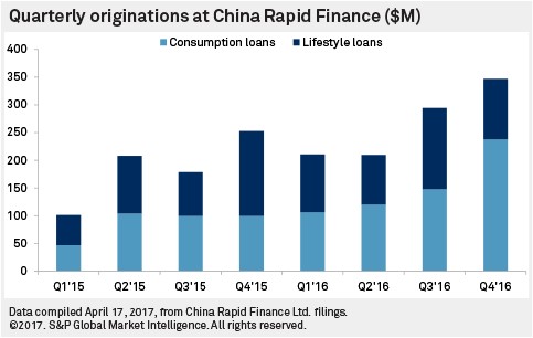 Loan originations are the lifeblood of a marketplace lender. Platforms in the space produce revenue through transaction fees charged to borrowers and servicing fees charged to investors. Originations for China Rapid Finance grew 43.4% to $1.06 billion in 2016. The company had 1.4 million borrowers as of year-end 2016, 67% of whom were repeat borrowers on the platform.