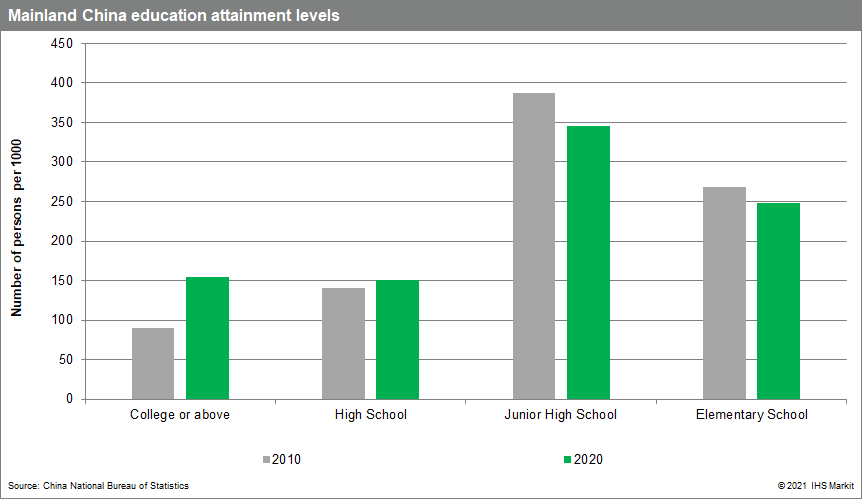 Before the policies to reverse demographic deterioration can take effect, the government can also limit the aging population's negative economic impact with other policies. Improving labor quality through enhancing the population's education level is one such policy. To this end, China has continued to make significant progress. On a per 1,000 persons basis, from 2010 to 2020, the number of the Chinese public with college-level or above education rose from 89 to 155 persons, a 74% increase.