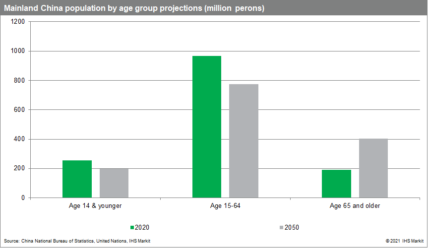 Mainland China's age 65 and older population totaled 190.6 million in 2020, 71.7 million higher than in 2010, according to the Seventh Population Census released by China's National Bureau of Statistics. By contrast, between the Fifth and Sixth Censuses of 2000 and 2010, the 65+ population rose by 30.7 million. The 65+ cohort's share of the total population rose to 13.5% in 2020 from 8.9% in 2010. By contrast, from 2000 to 2010, this age cohort's share of the total population only rose by 1.9 percentage points. Moreover, the latest census is the first in the reform and opening-up era, which began in the late 1970s, to find that the working-age population is shrinking. The age 15-64 cohort totaled 967.8 million in 2020 (68.5% of the total population), down from 999.4 million in 2010 (74.5% of the total population).