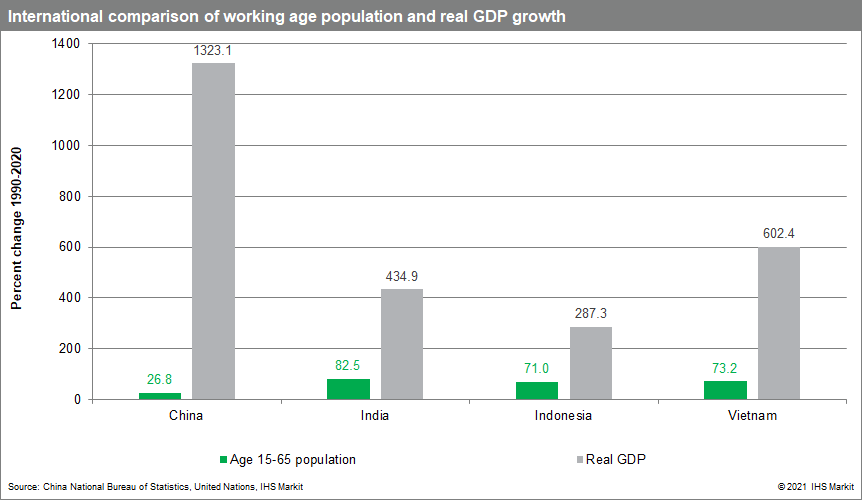 The recent demographic trend and the projected long-term deterioration are a reversal of the demographic dividends China has enjoyed during most of the reform and opening era. From 1990 to 2020, the working-age (15-64) cohort increased by 26.8% to 967.8 million. But from 2020 to 2050, the working-age population is slated to decline by 20.0. By comparison, the working-age populations of India, Indonesia, and Vietnam are projected to increase by 19.7%, 15.4%, and 1.9% over the same 30-year period, based on United Nations' forecast. If China's working-age population undergoes such a long-term decline, the Chinese labor force will shrink and thereby generating a drag on the economy's long-term growth.