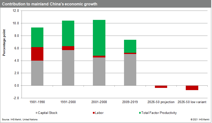 Looking forward, using the same growth accounting framework and the UN's projection for the working-age population decline, the falling labor force will drag on China's long-term economic growth from 2026 to 2050 by 0.4 percentage point annually. With the UN's low variant projection of a sharper decline in the working-age population, the labor force will pull down real GDP by 0.7 percentage point annually in 2016-2050. If China can maintain a moderately high long-term annual growth in the 4% range by implementing substantive economic reforms, then a 0.4- 0.7-percentage-point annual drag from a shrinking labor force is manageable. However, if China's productivity slowdown of the 2010s continues and economic growth further grinds down to the 2% range, then the shrinking labor force's 0.4-0.7-percentage-point drag on growth becomes daunting.