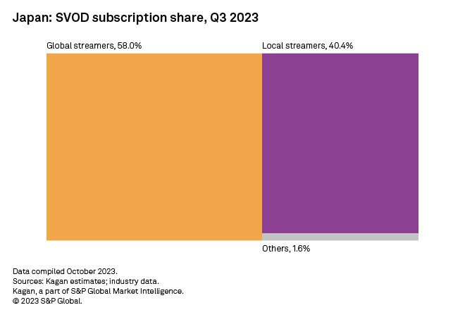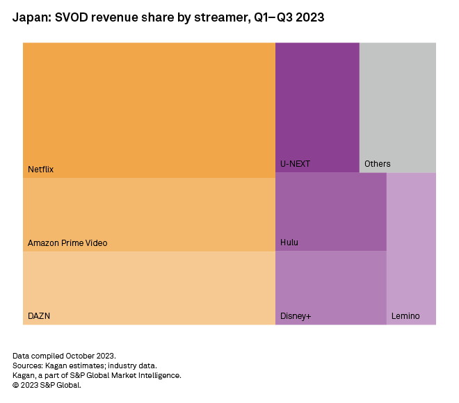 Prime Video and Netflix account for nearly half of Japan's total SVOD subscriptions and subscription revenue as of the third quarter of 2023. Together with DAZN Group Ltd. and Disney+ of Walt Disney Co., international streaming services add up to 58% of the market's total subscriber base. Kagan estimates that the rest is split among other companies, with 11 major local platforms totaling slightly over 40%.