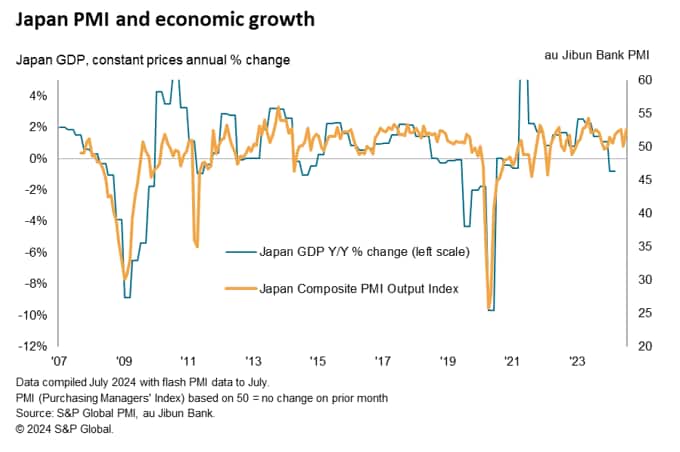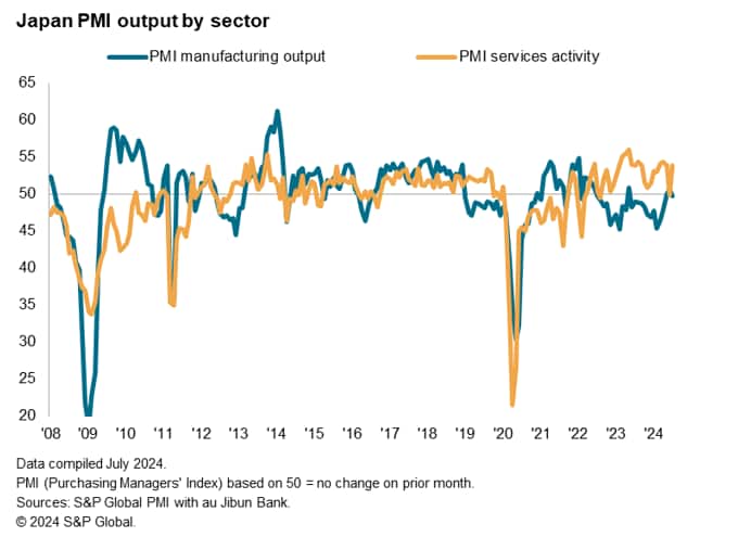 Japan's private sector returned to growth at the start of the second half of 2024. The rate of expansion was solid, though driven mainly by a booming service sector while manufacturing production contracted marginally in July.