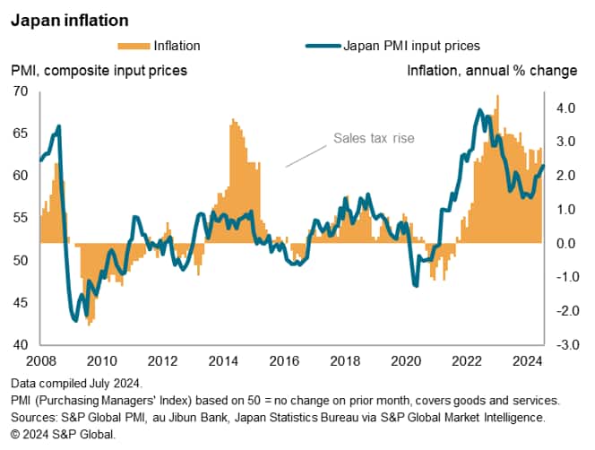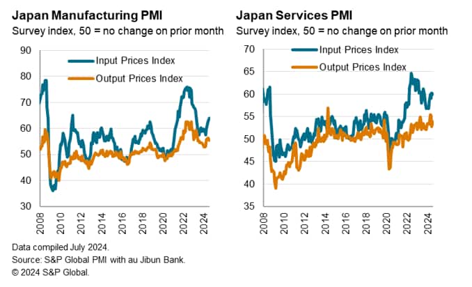 Cost pressures meanwhile climbed alongside the overall rise in business activity in July. Average input prices, measured across both the manufacturing and service sectors, rose at the fastest pace since April 2023 on the back of the yen weakness. This led to private sector firms raising their selling prices at a quicker rate in July.