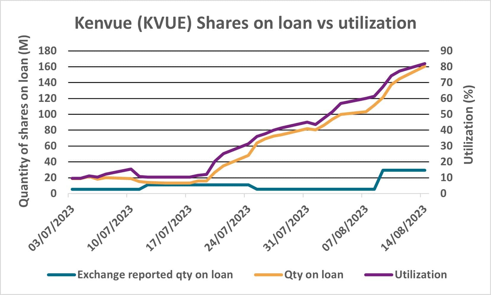 Since the offer allows holders of Johnson & Johnson shareholders to exchange their shares for common stock of Kenvue Inc at a 7% discount, an arbitrage opportunity has presented itself between the two lines of stock, sending both demand to borrow, utilization and securities lending fees increasingly higher over the last few weeks.