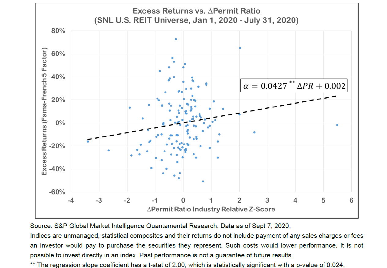 Using the BuildFax data on the S&P Global Marketplace, a one standard deviation increase in a derived permit ratio is associated with 427 bps of excess return over the same period.