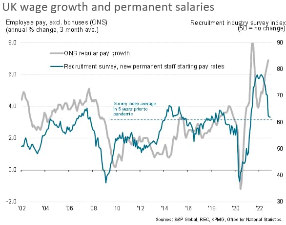 It's notable that the recent slowing of wage growth in the recruitment industry survey takes the rate of increase within a whisker of its pre-pandemic five-year average. This should naturally be of comfort to policymakers fearing the possible development of a wage-price spiral. However, it also suggests that underlying annual wage growth has fallen below 4% at a time when consumer price inflation remains in double digits. As such, real incomes appear to be falling sharply still, which will add to concerns over the cost of living crisis, as well as fuel fears of a further pull-back in consumer spending and accompanying recession risks.