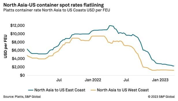 Not that it mattered, but the inconvenient truth was always very different and remains so today. Rates and profits spiraled upwards due to a consumer spending surge and capacity being removed from the market as ships were forced to wait for berths outside congested seaports. Of course, as soon as those conditions eased, rates promptly collapsed, falling over 90 percent in the trans-Pacific trade since last year, according to Platts, a sister product of the Journal of Commerce within S&P Global. Supply and demand drove the market up and then back down again.