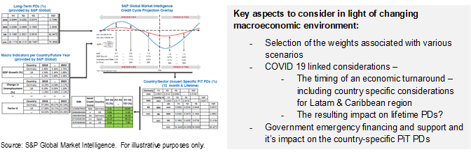 This TTC PD is subsequently adjusted to a Point in Time (PiT) PDs. S&P Global Market Intelligence we have designed our Credit Cycle Projection Overlay to uses macroeconomic and market data, which are country and sector-specific in order to convert from TTC to PIT basis. When considering how macroeconomic factors can impact PiT PD and which elements to consider you should not only consider macroeconomic aspects such as GDP growth, Unemployment rate, Change in Oil prices, Geopolitical tensions – both regional vs global – but also take into account reliability of macroeconomic forecast