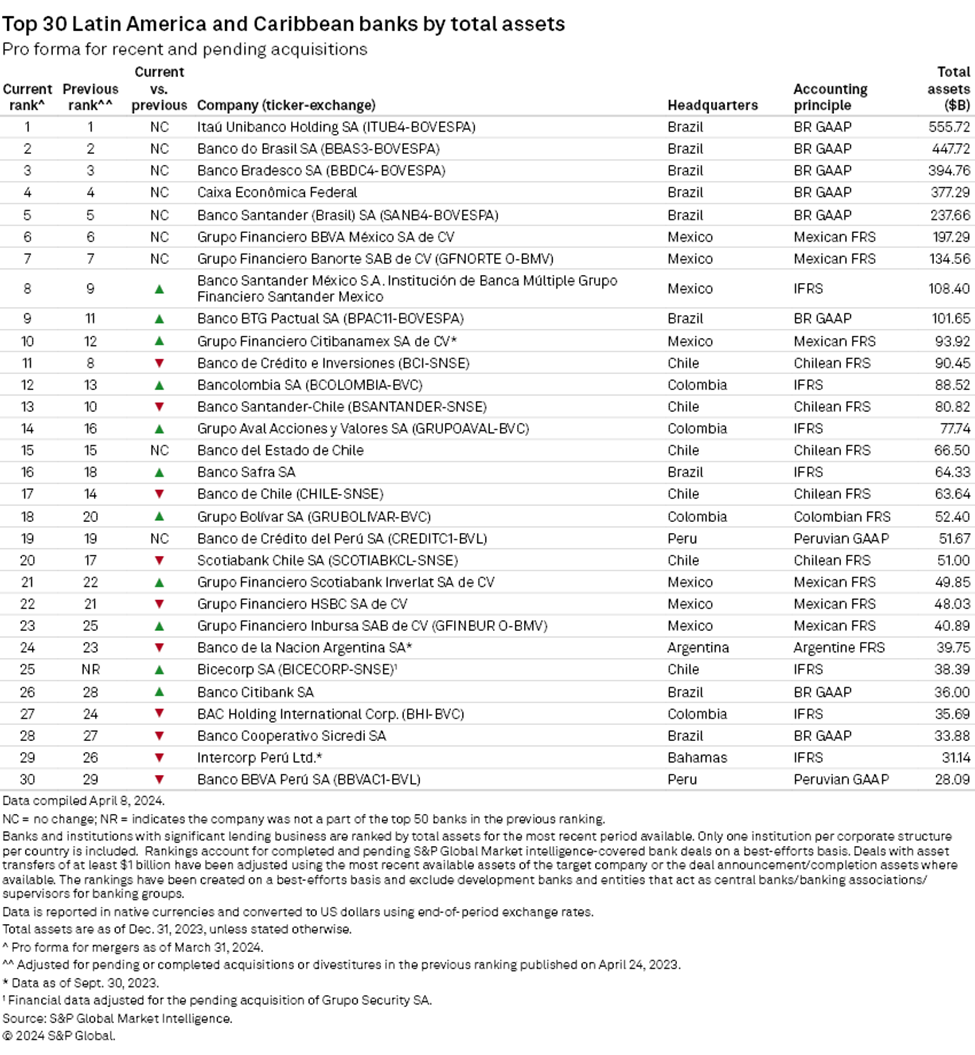 Brazilian and Mexican banks dominated S&P Global Market Intelligence's list of the biggest lenders in the Latin America and Caribbean region in 2023, filling every spot in the top 10.