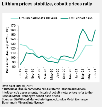 The London Metal Exchange cobalt cash price surged 24% to $23.81 per pound in the month to July 14, driven by further supply logistics disruptions from renewed lockdown measures and civil protests in South Africa affecting Durban port shipments.