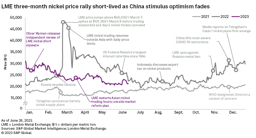The price recovery proved to be short-lived, however. Market optimism faded after the Chinese central bank followed up its previous short-term interest rate reduction with long-term lending rate cuts June 20, a decision that failed to meet market expectations for more aggressive monetary stimulus. This, combined with a firmer US dollar following hawkish comments regarding the future direction of interest rates from US Federal Reserve Chairman Jerome Powell, caused the LME 3M nickel price to drop to a new 2023 low of $20,056/t June 28.
