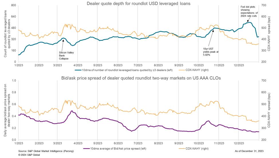 Leveraged loan liquidity conditions were showing steady signs of improvement from the October 2022 nadir through early March 2023, but quickly deteriorated following the collapse of Silicon Valley Bank and the domino effect it had on US regional banks and some European banks. There was an average of 339 loans highly quoted by dealers on March 10 that declined to 234 on March 24, while bid/ask spreads on AAA collateralized loan obligations (CLOs) increased from 0.30 to 0.50 during those dates. In late September 2023, AAA CLO spreads widened, while the number of highly quoted loans increased with bid/ask spreads at 0.15 on September 27 and 0.31 on October 17, in contrast to highly quoted loans increasing from 379 to 409 during those same dates. Both metrics reached their best levels of the year the week before the December holiday slowdown, with the number of highly quoted loans peaking at 550 on December 20 and the bid/ask compressing to 0.14 that same day.