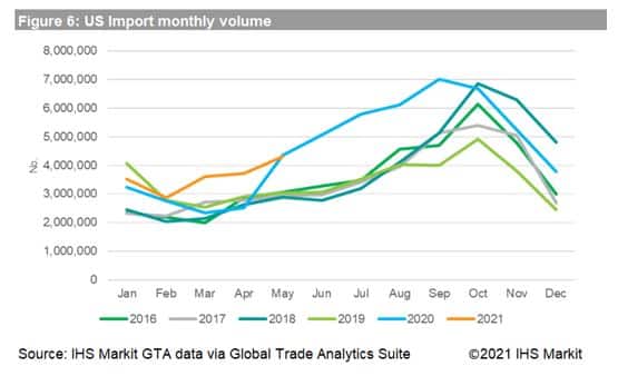 Comparing to pre-pandemic, monthly import momentum in May 2021 is still at a high level. As Figure 2 shows, the US imports in this single month has exceeded one million, up 39.23% year-on-year. Some reporters, for example France and Spain, doubled imports of this item in May 2021, comparing to last year same period.