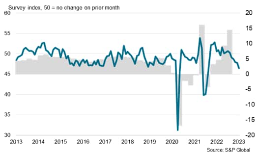 Reflecting softening momentum in the manufacturing sector, the seasonally adjusted S&P Global Malaysia Manufacturing Purchasing Managers' Index (PMI) dipped from 47.8 in December to 46.5 in January. The latest reading suggests that the gradual slowdown in manufacturing production and GDP growth at the end of 2022 continued into January 2023. This January PMI survey signals further moderation in the manufacturing sector in the near-term outlook.