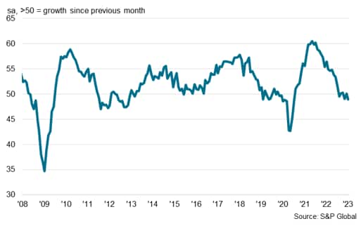 The headline S&P Global Electronics PMI posted 48.9 in January, down from 50.1 in December 2022, to signal a deterioration in operating conditions across the global electronics manufacturing sector at the start of 2023. The latest data indicated a renewed contraction in the global electronics sector, reflecting further declines in new orders and output.