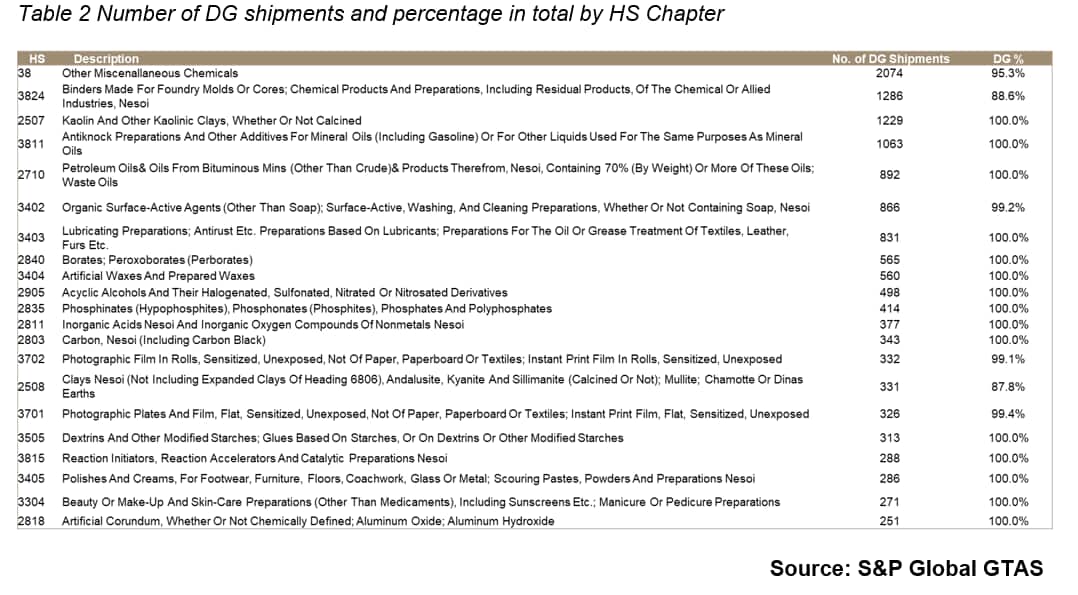 To validate another way that these commodities do feature 'dangerous goods', a reverse analysis on DG percentage in individual commodities' total shipments shows that nearly all of the chemical-related commodities are marked with a Dangerous Goods flag (95% - 99%), indicating strong consistency in HS mapping to DG.