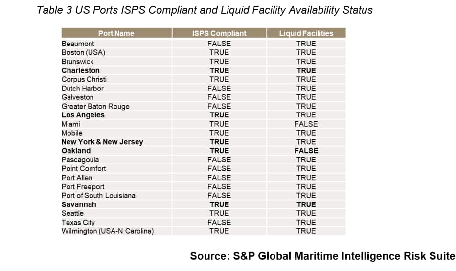 Port profiles also facilitate such understanding. Revealed by analysis of port data within S&P Global's Maritime Intelligence Risk Suite (MIRS), there are around 76 U.S. ports (including sub-ports) that are ISPS compliant; those with frequent DG shipments loaded are among them.