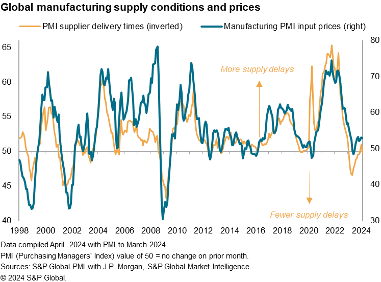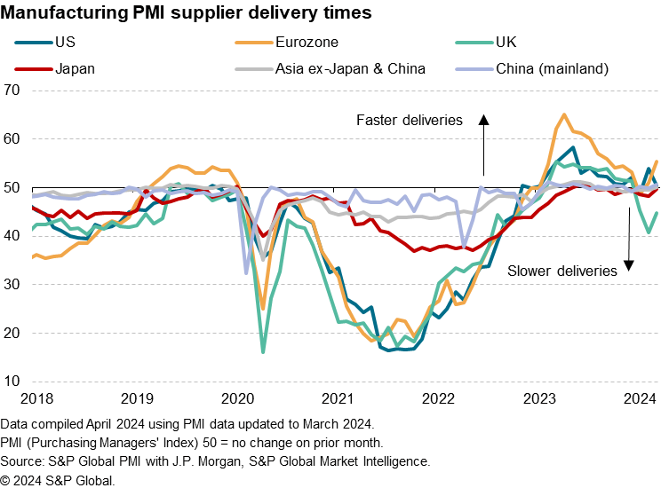 Average supplier delivery times quickened slightly in March, according to the latest global PMI surveys, pointing to a further alleviation of supply disruptions emanating from the Red Sea crisis. The improvement in supply chains is good news for inflation, as companies reported an associated easing of supply-related global cost pressures during the month.