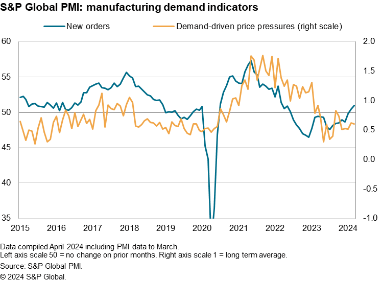However, just as supply-side inflation factors have eased, we may see some resurgent demand-pull inflation. With new orders growth picking up worldwide in March to its joint-fastest in two-years, it is likely that we will see some firming of demand-led pricing power in the coming months if the order book situation continues to improve.