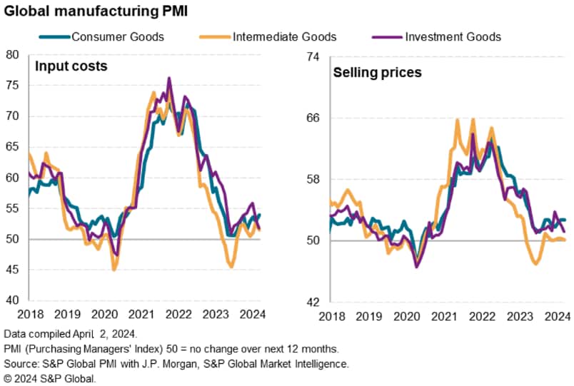 Furthermore, the impact on global consumer price inflation may be somewhat greater than signalled by the headline manufacturing price gauges. In terms of product type, consumer goods producers reported both the steepest growth of input costs and selling price inflation in March of the major product groups monitored, with the former notably inching up to a 12-month high.