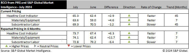 New York – July 24, 2024 – Engineering and construction costs increased again in July, according to the Engineering and Construction Cost Indicator from PEG and S&P Global Market Intelligence. The headline Engineering and Construction Cost Indicator, a leading indicator measuring wage and material inflation for the engineering, procurement and construction sector increased 2.9 points to 65.3 this month. The sub-indicator for materials and equipment costs rose 4.6 points to 63.6 while the sub-indicator for subcontractor labor costs edged down to 69.3 in July from 70.5 in June.