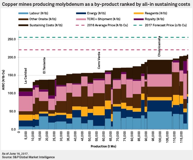 S&P Global Market Intelligence's Mine Economics data indicates that the current, relatively low level of molybdenum prices is putting primary producers under pressure. The three-month molybdenum price on the London Metal Exchange is up just 5% for the first half of 2017. This constrained price environment for molybdenum has led to a scaling back in production at the Henderson and Climax operations in the U.S.