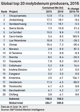 In Latin America, molybdenum output increased significantly on the back of increased production from the Chilean and Peruvian copper sectors. In addition to the 37.6% growth at Codelco's Chuquicamata, making it the largest producing operation in our dataset, Sierra Gorda (KGHM Polska Miedz SA) saw a 51.4% increase in output. This made Sierra Gorda the fourth-largest operation in 2016, with 10,552 tonnes of molybdenum. Output at Sierra Gorda is expected to peak this year, but this high output level will not be maintained in the long run due to gradual depletion of high-grade molybdenum ore. The planned Phase II of the project has been postponed due to market conditions. Cerro Verde (Freeport-McMoRan Inc.) reported a near tripling of output, which was attributable to the completion of an expansion project that achieved nameplate operating rates in the first quarter 2016.