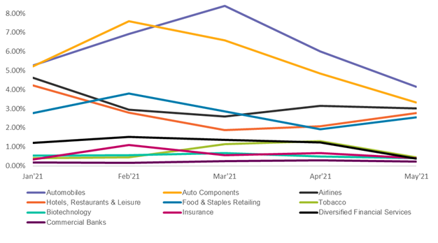 Chart 2 above shows the five sub-industries with the highest and lowest PDMS in May. Sub-industries with higher risks included Automobiles, Auto Components, Airlines, Hotels, Restaurants & Leisure and Food & Staples Retailing, while sub-industries with lower risks included Tobacco, Biotechnology, Insurance, Diversified Financial Services and Commercial Banks. Among the sub-industries with higher risks, Automobile and Auto Components have been at a high level since the beginning of 2021. Sub-industries with lower risks have stayed low throughout the period. Table 2 below shows the five sub-industries with the biggest declines in risk in May and the five with the biggest increases.