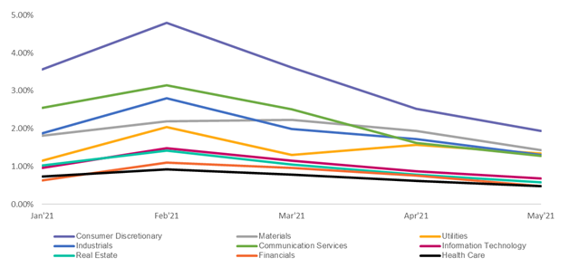 In May 2021, the credit risk for all sectors eased off somewhat compared to the month before. Energy, Financials and Materials posted a significant decline, while Communication Services, Information Technology and Utilities fell by a smaller amount. Significant changes were observed in the Energy and Utilities sectors compared to April. The Energy sector shifted from a stable state to a decline, while the Utilities sector dropped slightly after a drastic rise in April.
