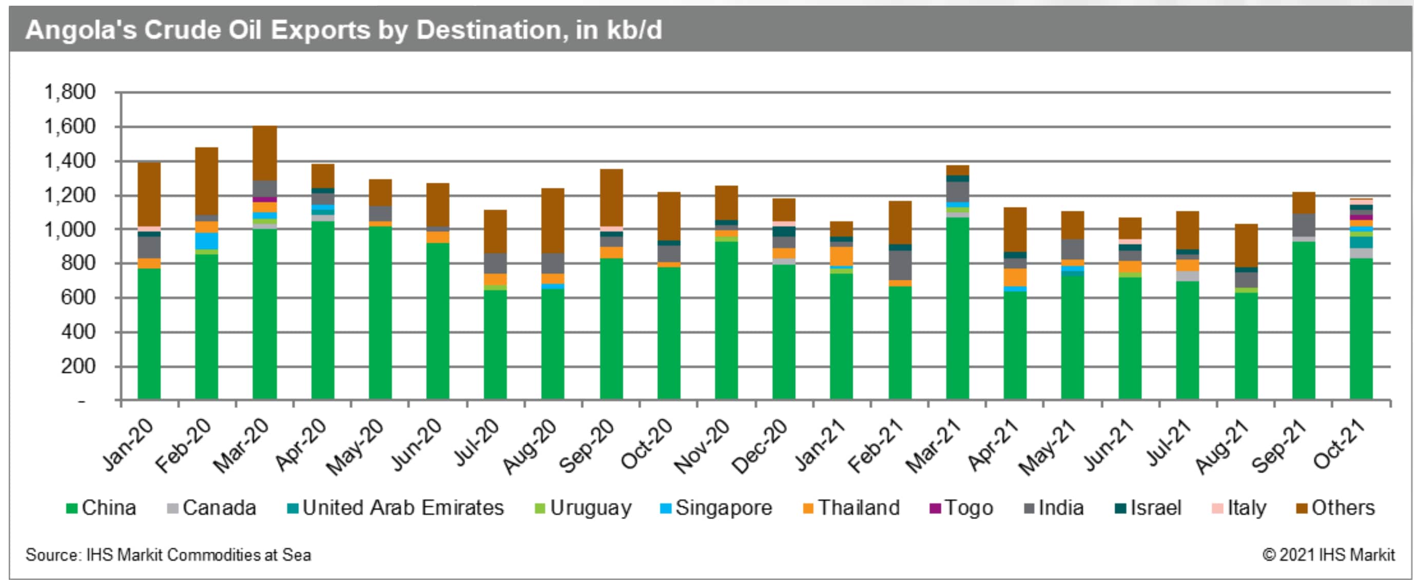 Angola's exports in August inched down 32,000 b/d to 1.19 million b/d, standing 2.6% lower than a year ago. Flows to China declined to 832,000 b/d in October, versus 928,000 b/d in September.