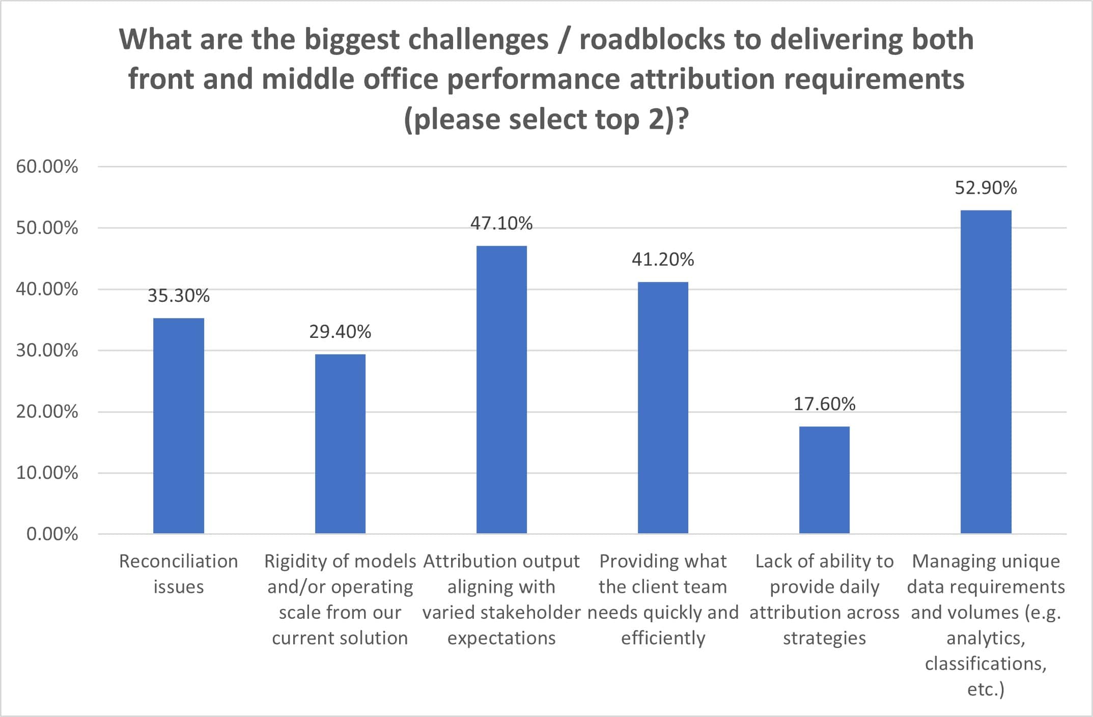 A separate poll question from the webinar showed that multi-asset managers struggle with several roadblocks when delivering both front- and middle-office performance attribution. The challenges include: managing unique data requirements and volumes (52.9%), aligning attribution output with varied stakeholder expectations (47.1%), and providing what the client team needs quickly and efficiently (41.2%).