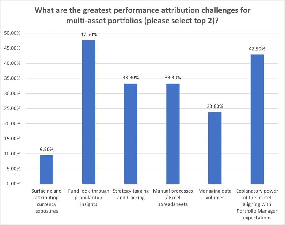 A recent survey of investment managers illustrates the long list of issues. Nearly half of respondents said they struggle to source the level of fund look-through granularity and insights they require for performance attribution. A large proportion (42.9%) also flagged challenges in their models' ability to provide adequate explanations for performance attribution across the respective return generation levers.