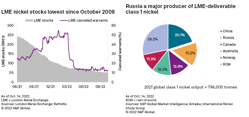 In mid-August, the LME banned Russian nickel exported before July 20 from its approved U.K. warehouses, after the U.K. government applied additional 35% duties on such material as part of sanctions against Russia. The exchange had, however, resisted calls to ban Russian nickel from all its global warehouses because Norilsk had yet to be sanctioned by the government. The exchange now appears to be reevaluating this stance on intensifying concerns that if consumers from markets now imposing sanctions on Russia refuse to accept Russian material for 2023 during the current mating season negotiation period, this could push Russian producers such as Norilsk to dump excess metal into LME warehouses as a last resort. As Norilsk is the world's largest producer of LME-deliverable class 1 nickel making Russia the second-largest class 1 nickel producer, behind only China, according to our estimates such a move by Norilsk could cause LME nickel stocks to rise from their current lows and so put downward pressure on LME nickel prices.