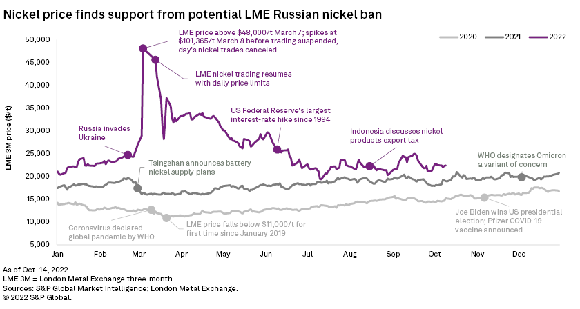 More than seven months since the dramatic nickel market short squeeze and trading suspension on the LME, the market is anxiously waiting for the results of a key consultation by the exchange. With the threat of rejected Russian metal being dumped into the LME's warehouses looming large, the exchange has launched a formal discussion on whether it should ban deliveries of such material into its sheds. The deadline for feedback on the issue is Oct. 28, the final day of the upcoming annual LME Week gathering in London. As LME Week represents a key part of the current "mating season" negotiation period, developments during the week are likely to give an indication of consumers' appetite for extending annual contracts with Russia's PJSC Mining and Metallurgical Co. Norilsk Nickel into 2023. If buyers decide to shun Russian-origin nickel for 2023, the LME may decide to ban new Russian metal from its warehouses. This could bolster nickel prices, which are currently being battered by macroeconomic headwinds.