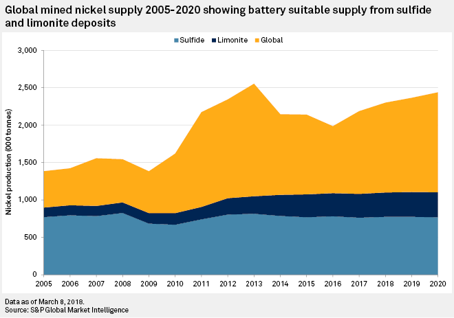 Lithium-ion batteries used by many of the major electric vehicle manufacturers use a cathode that is primarily composed of nickel. However, not all nickel supply is suitable for manufacturing battery cathodes. Only 49% of 2017 nickel supply, from sulfide and limonite deposits, is suitable for this purpose, and extracting nickel from the latter deposits is less attractive as costs are generally higher than from sulfide deposits.