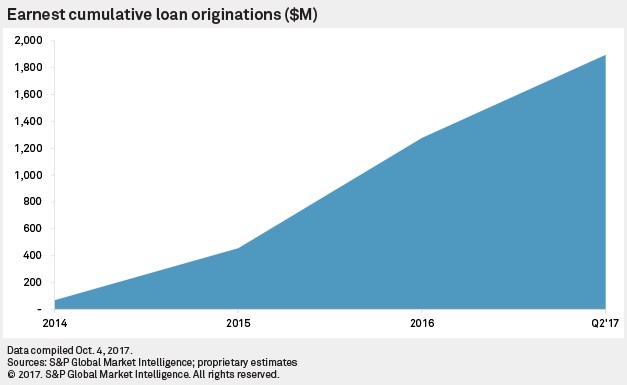 Earnest is one of the few student-focused digital lenders, alongside CommonBond Inc. and Social Finance Inc. While the company started as a platform for personal loans in 2014, the student loan refinance product added in 2015 became Earnest’s focus. Through the second quarter of 2017, Earnest had originated nearly $1.9 billion in loans since its founding, according to S&P Global Market Intelligence estimates.