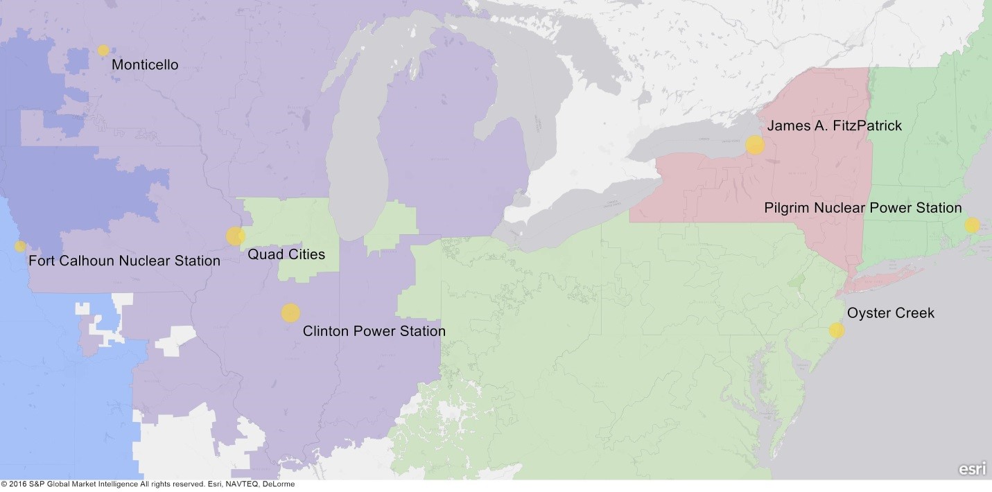 Of the plants shown, the owners of Fort Calhoun, Quad Cities, Clinton Power Station, Fitzpatrick, and Pilgrim all announced plans to retire within the last 9 months. The loss of baseload capacity can be expected to affect power prices and reserve margins in the Southwest Power Pool, Midwest ISO, the PJM Interconnection, the New York ISO, and ISO New England, respectively. It is a broad result that will impact market prospects for generation owners and developers in several regions, as well as impact greenhouse gas emissions policy. Given the implications, news around these power plants is evolving rapidly, with New York pursuing subsidies to reverse the retirement of Fitzpatrick and other nuclear plants in New York. A similar effort to gain subsidies for the Illinois plants Clinton and Quad Cities was unsuccessful. Finally, California is contemplating retirement of its last nuclear plant before 2025.