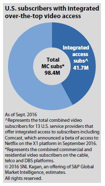 Comcast is phasing in access to a Beta version in October, but it expects full deployment before the end of 2016. The inclusion of Comcast’s 22.4 million video subs will more than double the number of OTT-integrated multichannel subs to 41.7 million and account for 42% of the combined cable, telco and DBS subs in the U.S, according to SNL Kagan estimates.